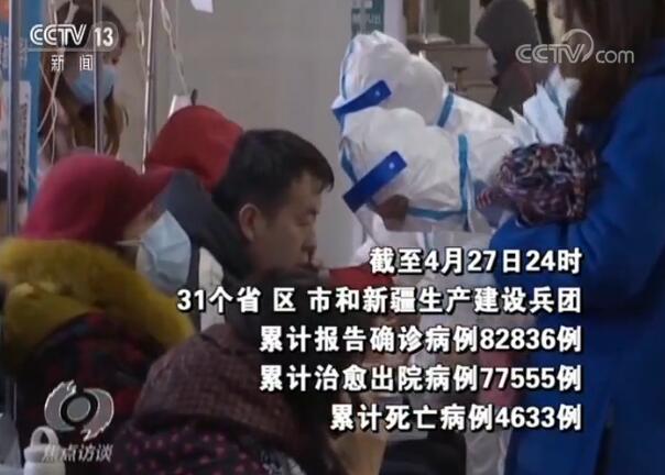 这次疫情是新中国成立以来,在我国发生的传播速度最快、感染范围最广、防控难度最大的一次重大突发公共卫生事件。截至4月27日24时,31个省(区、市)和新疆生产建设兵团累计报告确诊病例82836例,累计治愈出院病例77555例,累计死亡病例4633例。