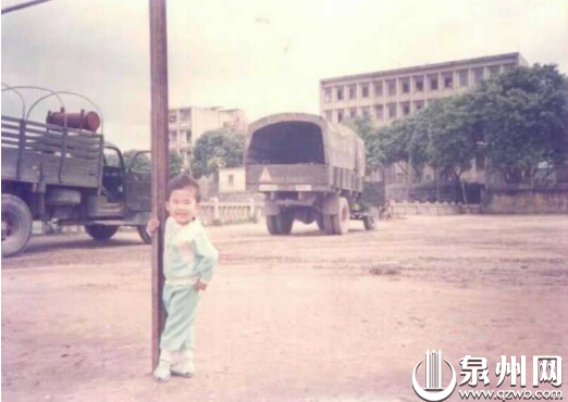 这是小朋友当年在体育场边上健身器旁的留影,可以看到当时体育场的石栏杆,远处是体委办公大楼。