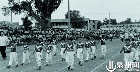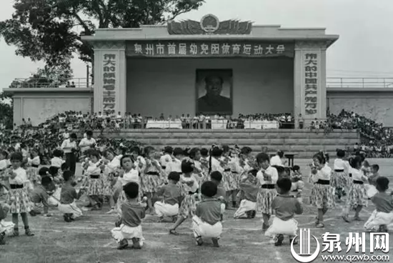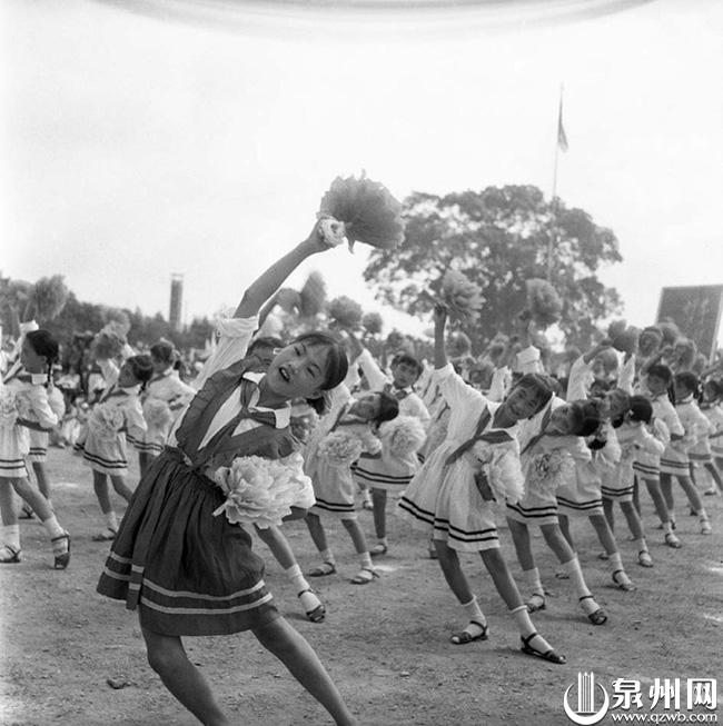 泉州市首届幼儿园运动会上的团体操表演。后面的围墙、电线杆是当时的灯光球场。(黄百宁/摄)