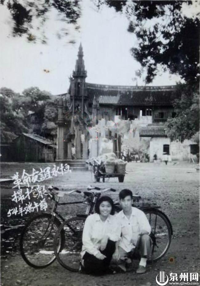1954年,一对青年男女骑着两辆自行车来纪念碑前合影,后面可以看到威远楼下的入口。(图片来自网络)