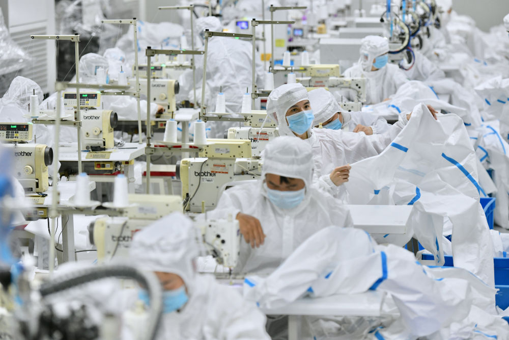 在福建晋江,工人在生产防护服(2月4日摄)。新华社记者 姜克红 摄