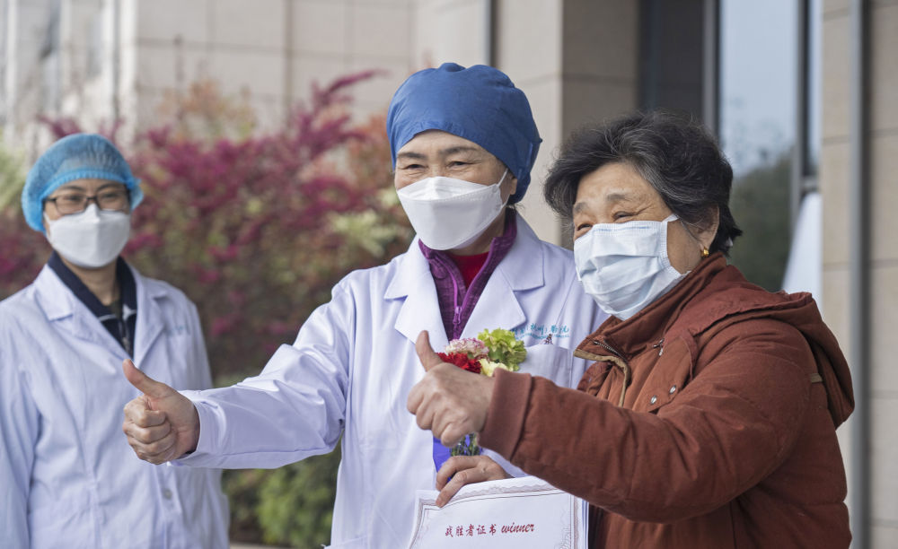 在武汉大学人民医院东院区,李兰娟(中)与出院患者合影(3月16日摄)。新华社记者 才扬 摄