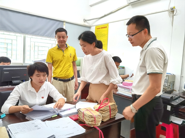图3:台商投资区国库支付中心工作人在群青村指导村会计工作。村主任林志民(右一)与村报帐员介绍财务报支流程等情况。
