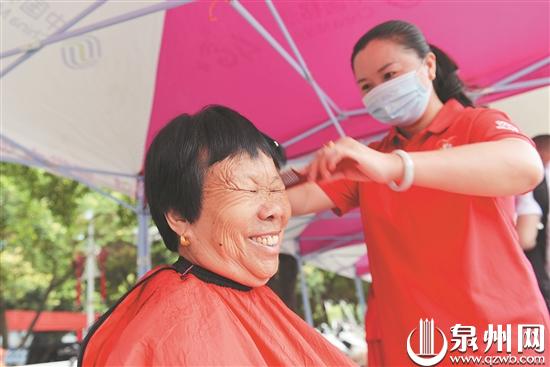 “很开心,免费(理发),谢谢大家了。”林玉英大妈笑得合不拢嘴。