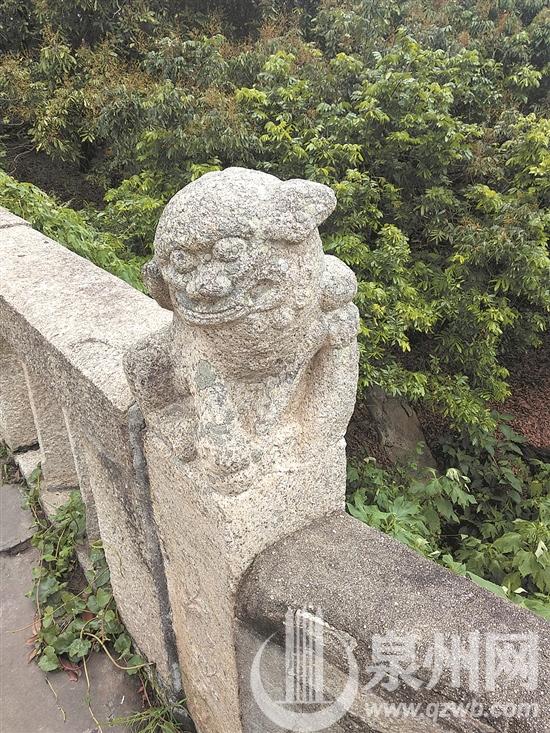 当天上午10点,在刘良州的带领下,一行人来到惠安县城平山一个果林场附近。在上平山的山路一座桥头,护栏各竖立着一只石狮子,在另一侧桥头,则各立有一根石文笔。石狮加上底座高约1.2米,石文笔高1米左右。石雕花岗岩材质,在岁月的浸洗之下,它们和筑桥的花岗岩几乎融为一体。