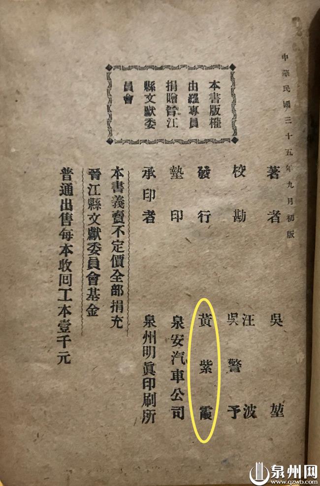 1946年吴堃撰写的《泉州留府庭七部棺考证》,文后发行者就是黄紫霞(吴沧阳/供图)。泉山书社不仅销售图书文具、体育用品、中西乐器等,还发行图书,并通过泉山印刷所印刷学生作业簿,承印《泉州府志》《晋江县志》等书刊。