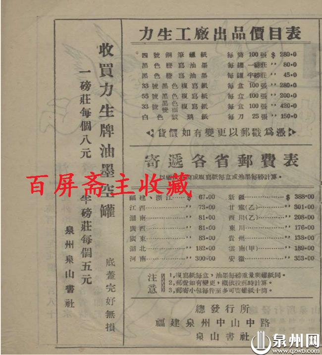 泉山书社力生工厂的广告,可以看到生意一直做到了新疆。(黄方收藏)