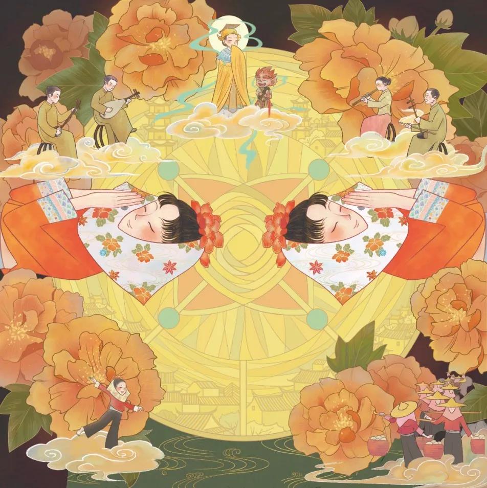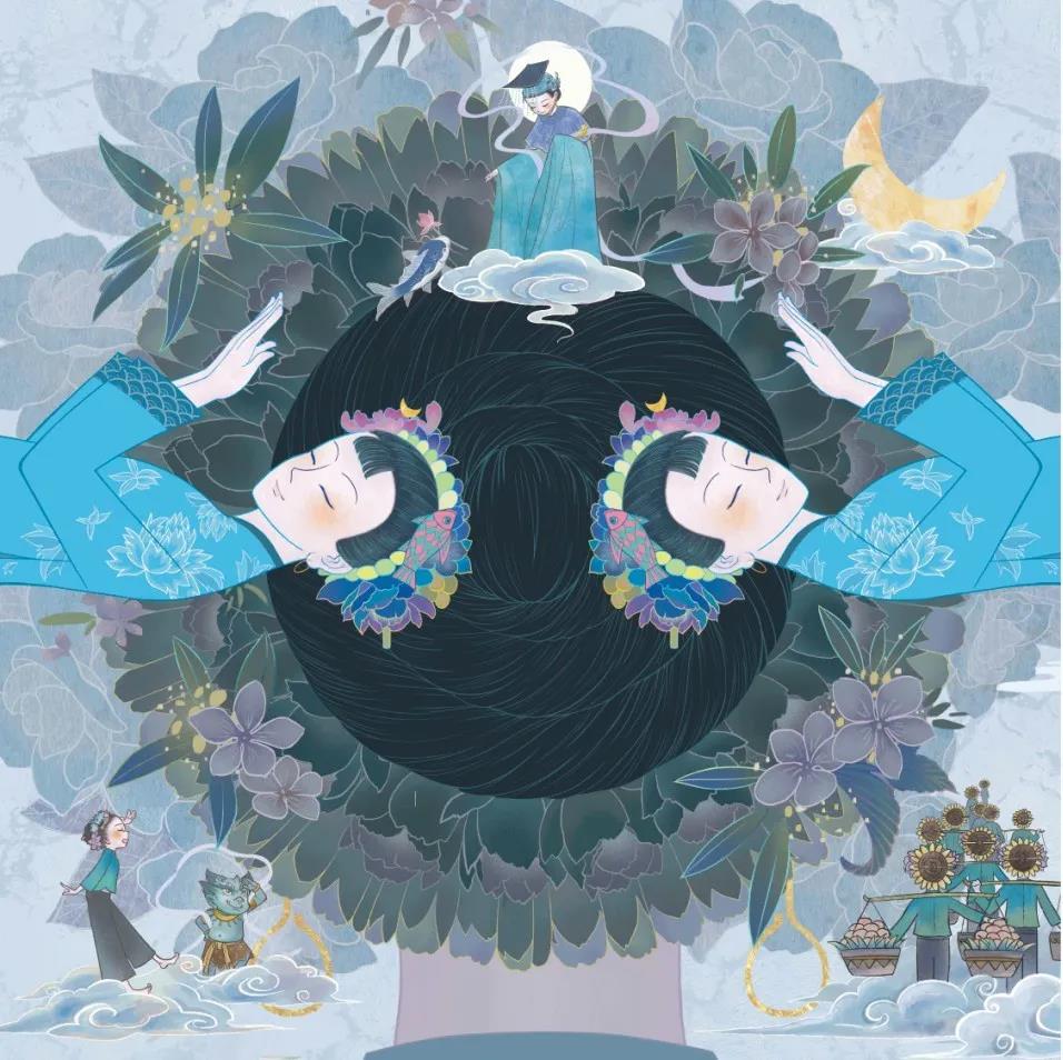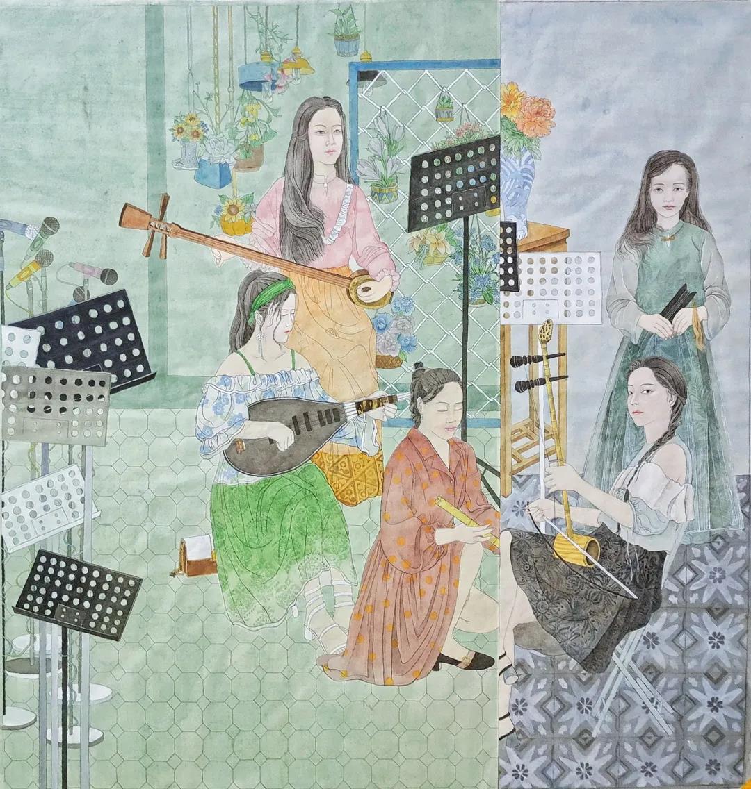 作品创作取材于南音。为了不违背南音的演奏形式,在画面情境空间设置上又需要呈现出特定的视觉感受,作者将人物置于教室这个空间中,使其视觉有课堂一角的轻松感和充满曼妙的画面。在服饰上作者采用一些现代图式元素,将乐器的古朴同现代图式相结合。(作者/洪亦蓝 指导老师/吴跃华)