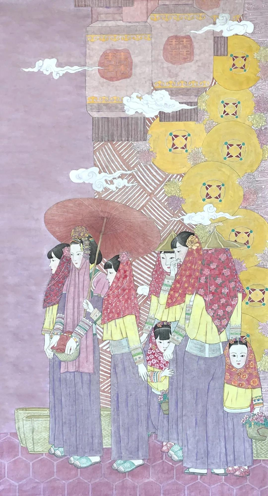 作品创作主题取材于小岞惠女的嫁女婚俗,以《诗经》中“桃之夭夭,灼灼其华。之子于归,宜其室家”的诗意来描绘婚俗的场景之一“送亲”,表现这传统婚俗文化中所展现的美好、热闹的一面。(作者/杜佳欣 指导老师/黄思阳)