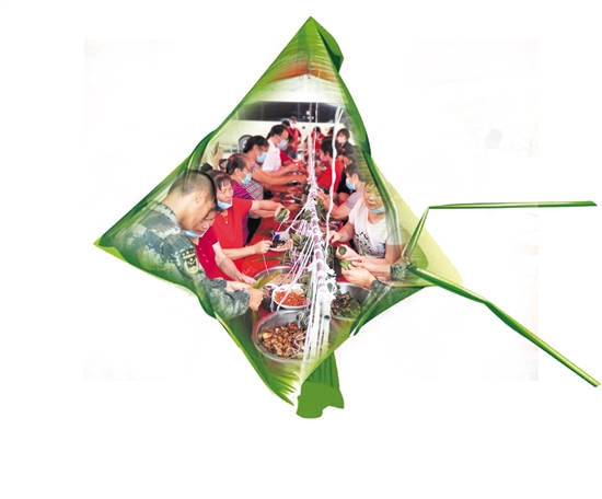 在现场,与粽子制作有关的食材整齐排开,五花肉、糯米、鸡蛋、肉松、红枣、粽叶等应有尽有,折叶、填米、放料、扎线等一道道工序有序进行,一张张普通的粽叶在大家手里变成了ー个个漂亮的粽子。两地群众互相学习包粽子的技巧和方法,其乐融融。