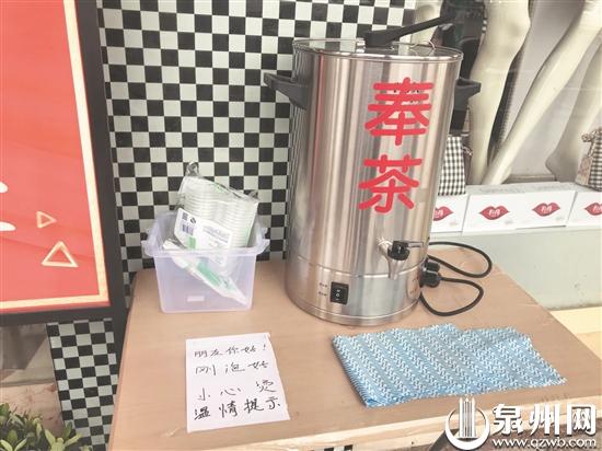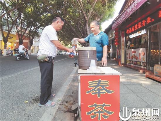 在市区新华路一家药店门口,记者也看到了一个奉茶点。药店工作人员表示,他们从6月份开始奉茶,一天需要两三桶,“我们店是2015年开业的,2016年就开始奉茶了”。不管是市区主干道丰泽街、田安路、涂门街、刺桐路和泉秀街,还是支路浦西路、温秀街,记者看到多家商店门口都摆放着奉茶摊。
