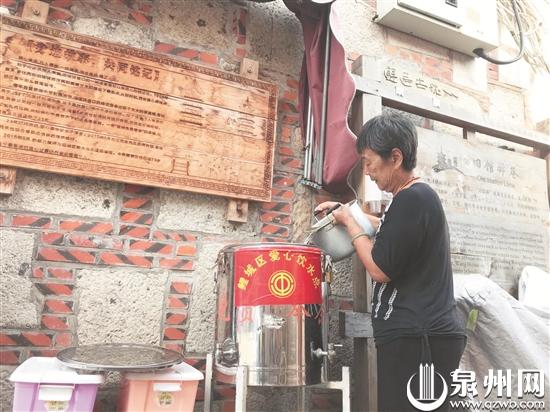 黄惠兰介绍,她是惠安人,八九岁时跟着母亲走山路去找亲戚,走到半路口干舌燥却找不到水,后来终于遇到一户人家,门口摆着一桶茶水供路人免费饮用,“直到今天还能想起那个茶清凉解暑的味道”。当时她心里就在想,以后有条件的话,自己也要免费奉茶。1995年端午节前后,她和丈夫苏汉民决定在西街摆个奉茶点,为来往行人提供消暑凉茶。这一坚持,就是20年。2015年,苏汉民去世,黄惠兰继续照顾茶摊,为路人免费提供茶水。