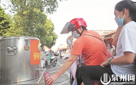 在市区刺桐路一家酒水专卖店门口摆放着一块醒目的牌子,上面写着“免费茶水 特别向烈日炎炎下的户外工作者——环卫工人、交警同志、快递小哥、外卖小哥等默默付出的城市劳动者致敬”。在涂门街,摆放保温桶的桌子上还放着一张字条,写着“温情提示:朋友你好,刚泡好,小心烫”。
