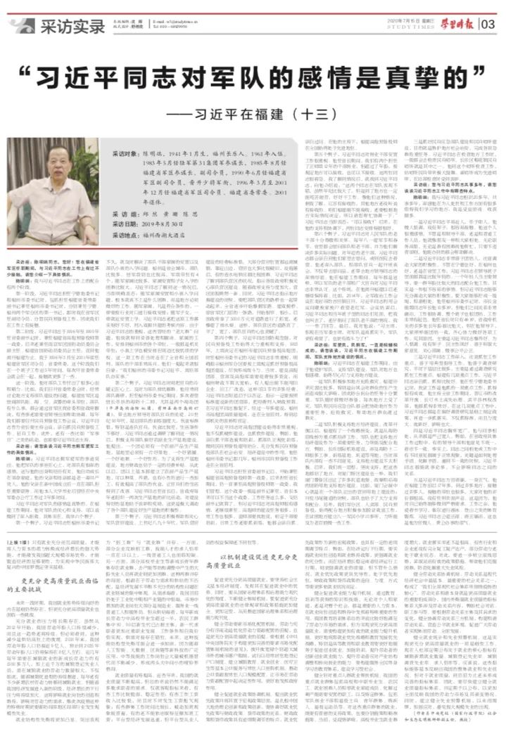 陈明端:习近平同志在福建工作期间,由于他爱护军队、支持军队建设,军队对地方也很感激,始终尽心尽力支持地方建设。