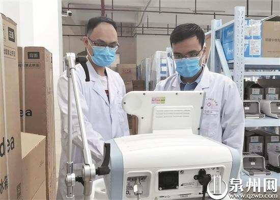 高艺鹏(左)与同事检查病区内的医疗设备