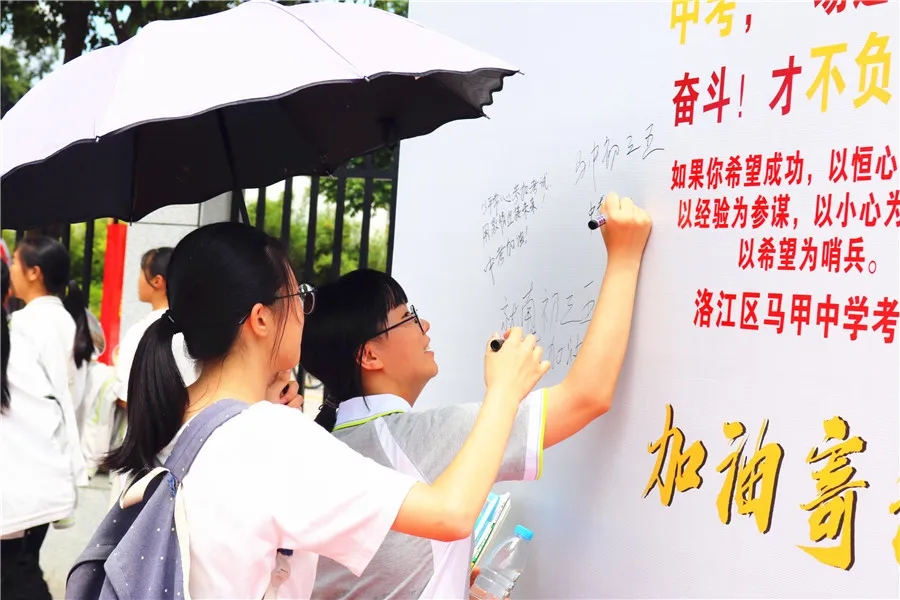 值得一提的是,在马甲中学考点,志愿者们还别出心裁地准备了加油寄语板,为考生们加油鼓劲,深受家长和考生欢迎。