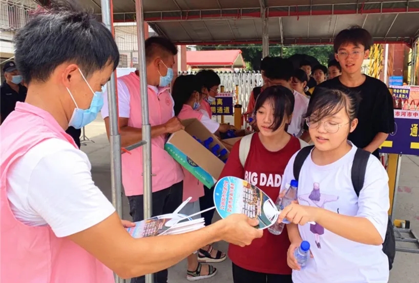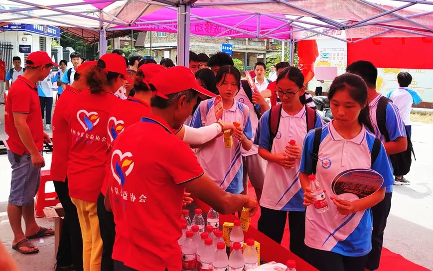 在各考点志愿活动现场,志愿者们早早搭起遮阳凉棚,摆好桌椅、矿泉水,准备好降暑降温应急药品等,为考生和家长提供乘凉、休息场所,在炎热的夏日里为他们送上一份清凉和安心。