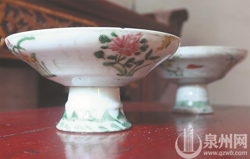 林诗景说,1990年古厝进行过一次小修复,但梁木等依然保留最初的模样。推门而入,一楼厅堂的木刻楹联古色古香;扶梯而上,二楼门窗仍保留着精致的木雕,深红色的门窗木器、深蓝的砖雕描边,历经数十年风雨仍清晰如往昔。“地板上的六角红砖,原本是大六角形,修复时找不到这样的砖头,才换了这小六角形的。”林诗景很爱惜父亲留下的产业,厅堂里的八仙桌、佛前供花的花瓶、供果的瓷盘,都被他精心保管收藏,前些年他还将一对罕见的“天公灯罩”捐给了泉州华侨历史博物馆。