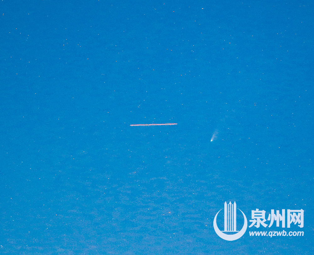 7月23日20时许,在泉州清源山实拍“黑马”彗星——尼欧怀兹彗星C/2020 F3(NEOWISE)时,一架飞机刚好从彗星附近天空飞过。该彗星当天经过近地点,这几天都是观测这颗罕见大彗星的良机。大家有机会在傍晚时的西北方低空见到它,等它下一次接近地球将是在6800年后。 (记者潘登 摄)