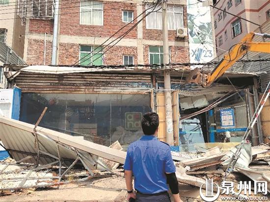 电线杆被包进手机卖场内,城管依法拆除违建。