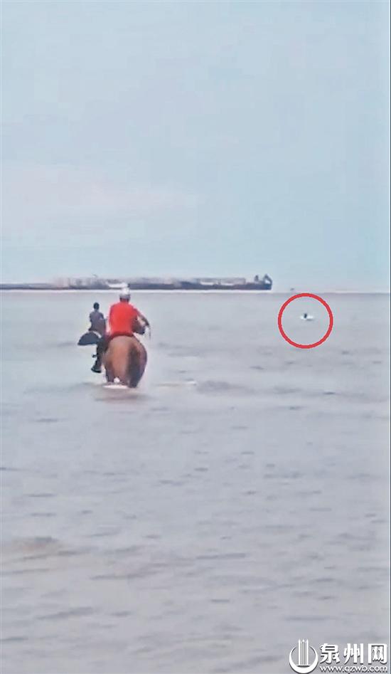 蔡良兴说,马的身高1.7米左右,越往外海走,海水越来越深,渐渐淹到了马的头部位置,虽然马生来会游泳,但担心它在海里会受惊失控,他自己不会游泳,见状赶紧调转马头,返回向游客借了一个游泳圈,再次骑着马冲进海里救人。