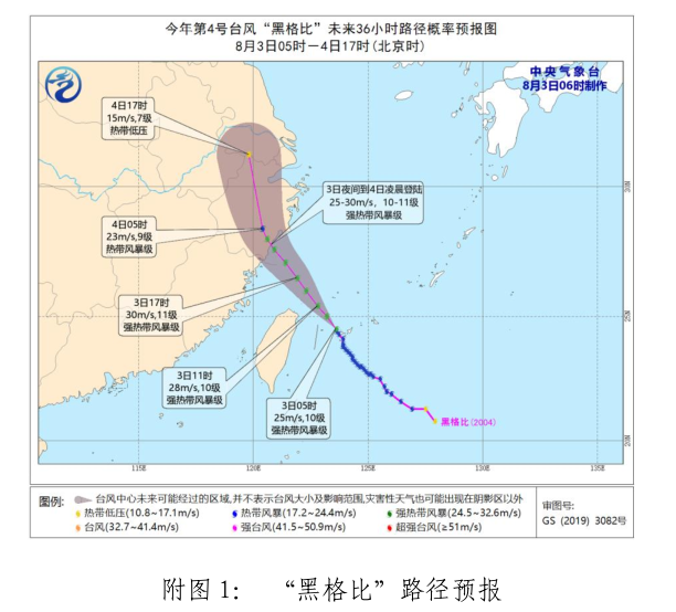 预计“黑格比”将以每小时23公里的速度向西北方向移动,强度逐渐增强,向浙江南部到福建北部沿海靠近,并于3日夜间在这一带沿海登陆(强热带风暴级,10~11级,25~30米/秒)。登陆后,强度逐渐减弱(见附图1)。