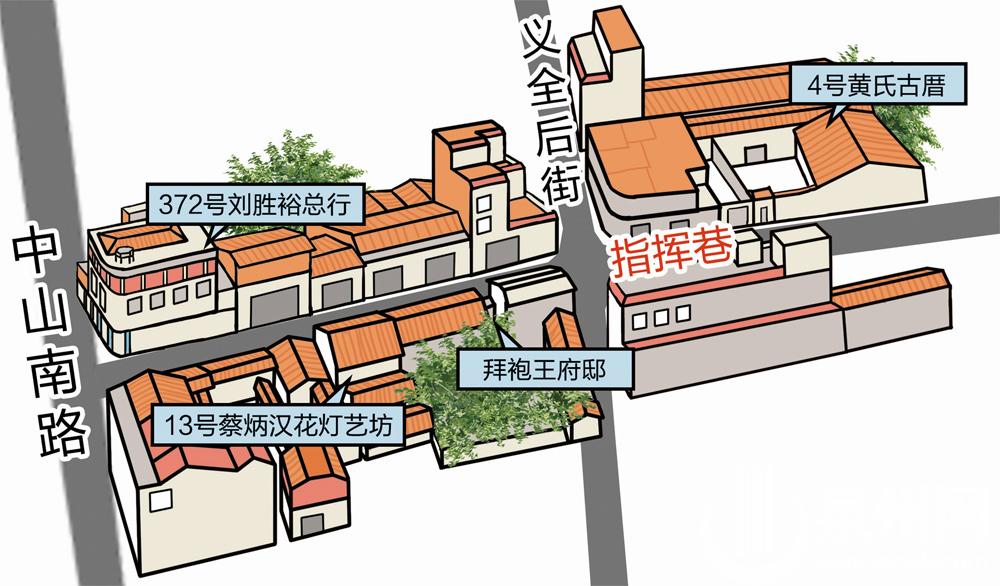 一道朱红木门,一对古朴小巧的石鼓,让位于指挥巷门牌号11号和13号之间的拜袍王府邸,与两侧紧邻的店面形成鲜明反差。这里曾是明代指挥衙,暗藏小巷巷名“密码”。