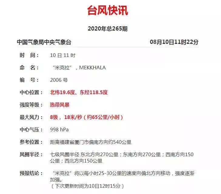中央气象台8月10日消息,10日上午11时,6号台风“米克拉”在南海海面生成。“米克拉”将以每小时25-30公里的速度向偏北方向移动,强度逐渐加强,并于11日上午在福建沿海登陆,登陆后强度逐渐减弱。