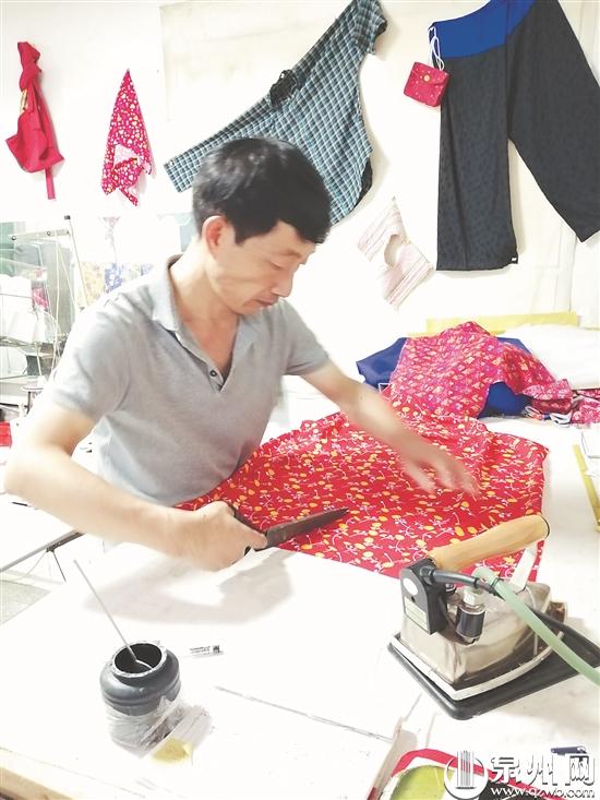 黄晨的夫人黄翠婷受他的影响,也从事蟳埔女服饰的制作。黄翠婷介绍,制作一件蟳埔女服饰,需要多个步骤:选布料,根据需要,选择颜色、花色适中的布料;画线,根据顾客身材的尺寸,以木尺丈量,在布料上画出基本的形状;裁剪,将画好的布料用剪刀裁剪出来,再进行拼合,用熨斗熨平整;缝合,用针线将外衣和内襟缝合起来;缝布纽,将布纽扣缝在制好的上衣上。