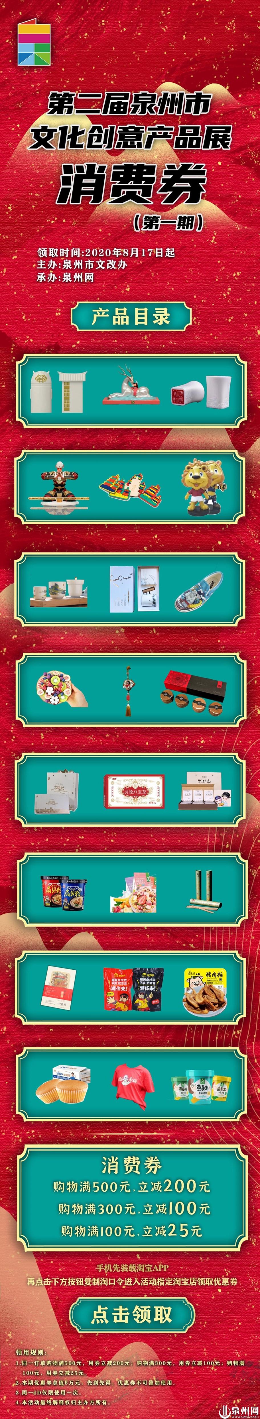 泉州网8月16日讯(记者 黄艺芬)由泉州市文化改革发展工作领导小组办公室主办,泉州网承办的第二届泉州市文化创意产品展17日正式启动,首批超过1000张消费券17日0时开抢,领用攻略如下: