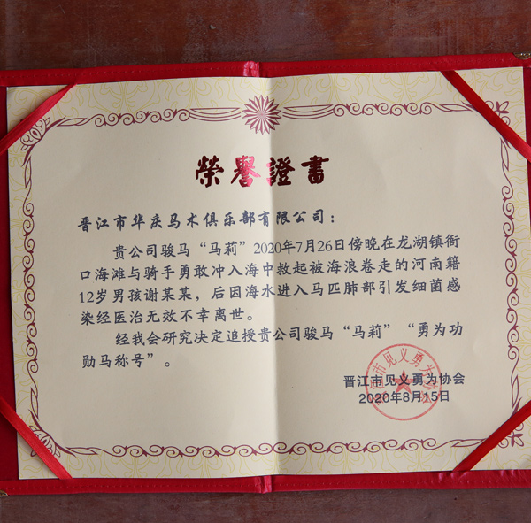 “马儿和主人一样英勇!” 获此消息后,晋江市见义勇为协会会同晋江市公安局相关部门第一时间研讨,决定由晋江市见义勇为协会追授两匹“英雄马”为“勇为功勋马”称号。据悉,这也是晋江市首次追授“勇为功勋马”。“很替马儿惋惜,追授‘勇为功勋马’称号是希望以此弘扬社会正气,激励更多人加入到见义勇为行列中,也希望能够警示更多人珍惜生命。” 晋江市见义勇为协会会长陈永聪说。