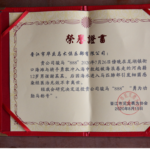 7月26日下午,一男孩在晋江龙湖衙口海边游完不慎被海浪冲走,在海滩骑马游玩的蔡良兴、施国庆等人骑马下海救起男孩。事后,晋江市公安局第一时间启动见义勇为确认程序,第一时间展开调查取证,将蔡良兴、施国庆救人行为确认为“见义勇为”。不幸的是随主人下海救人的两匹马“888”“马莉”因此得病离世。
