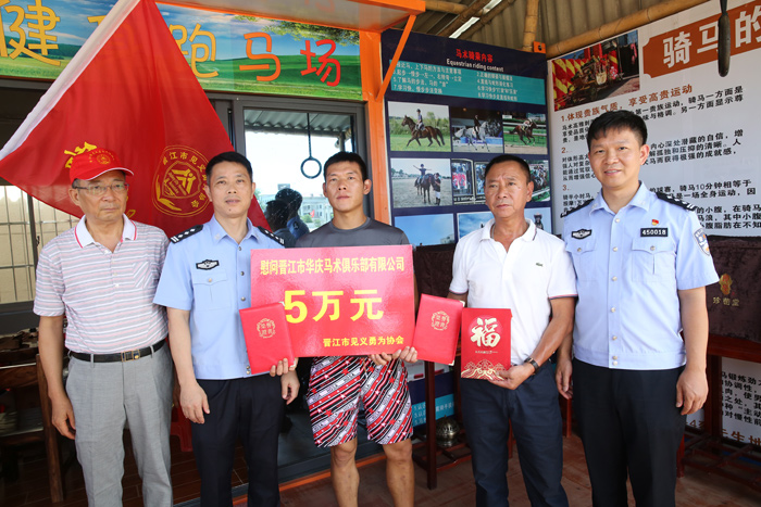 泉州网8月17日讯(记者张晓明 黄祖祥 通讯员陈耀宗 庄凌龙 文/图)8月17日上午,晋江市公安局句长李森建率队慰问,向晋江市华庆马术俱乐部发放5万元奖金,并向晋江两匹下海救人的“英雄马”“888”“马莉”追授“勇为功勋马”称号。
