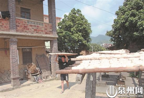 烈日如火。潘贤瑞的老房子庭院前支着一整排的架子,上面晒着一些半成品面条。