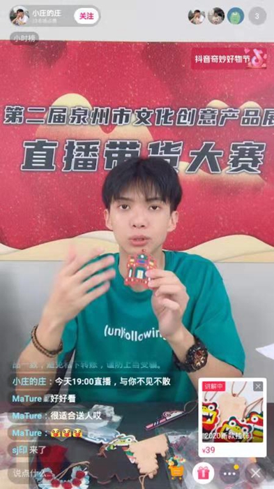 泉州网8月19日讯(记者 黄艺芬)17日,由泉州市文化改革发展工作领导小组办公室主办、泉州网承办的第二届泉州市文化创意产品展正式启动。当天19时—21时,文创展系列活动之直播带货大赛重磅开启,5名泉州青年主播、7名企业网店主播组成文创直播团,在抖音、京东、腾讯、淘宝等平台为泉州文创带货,24小时内成交额近11万元。