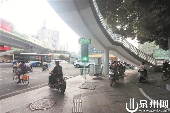 泉州市区温陵路与涂门街交叉路口处的天桥于2008年1月正式通行,由于通行不便,电动车骑手大多选择借助天桥下的机动车道通过该路口,导致机非混行,存在交通安全隐患。