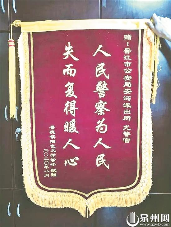 泉州网9月4日讯(记者 张晓明 黄祖祥 通讯员 庄凌龙 伍茵茵 文/图)9月2日,晋江市公安局安海派出所社区民警尤永宁收到一个快递,他感到有点意外,自己近期并没有网上购物,哪来的快递?打开快递一看,里面是一面锦旗,锦旗上印着“人民警察为人民,失而复得暖人心”。这面锦旗是从600多公里外的江西景德镇寄过来的,寄件人是景德镇陶瓷大学的一名学生,为的是感谢尤永宁及时帮他要回转错的钱款。这事还要追溯到8月12日那一天。
