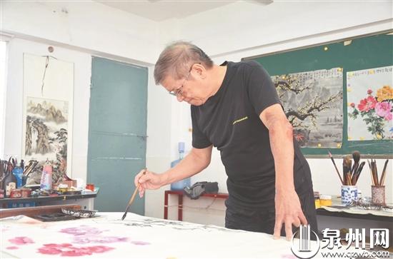 泉州网9月8日讯 (记者王丽虹 通讯员施远圻 文/图)戴着眼镜、双目炯炯有神……桌案前,手握毛笔俯身作画的这位老者叫杨继农,今年74岁,是鲤城区实验小学退休美术教师,正在为个人国画义卖作品展作准备。老杨热心公益事业,近几年,他曾举办过两次国画义卖作品展,义卖所得善款均用于帮助患病、贫困学子。