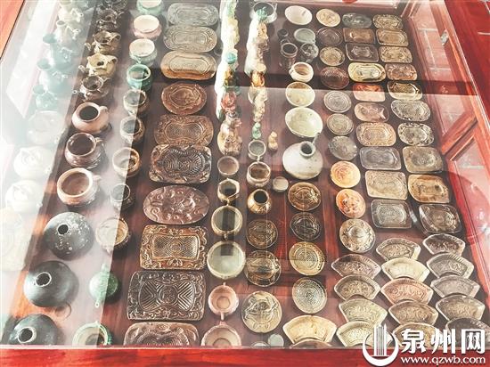 来到曾国思的收藏室,就被柜台上的一个个粿印所吸引。在闽南地区,每到重要的节日,最热闹不过的就是做红粿,最常见的是红印粿,许多重大的节日都用它,相信在闽南一带生活的人对粿印都会有印象。曾国思所收藏的每一个粿印,在他的眼里,都充满着感情。他对自己收藏的三四百个粿印,都了如指掌,娓娓道来,眉飞色舞,可见他对这些藏品的喜爱程度。