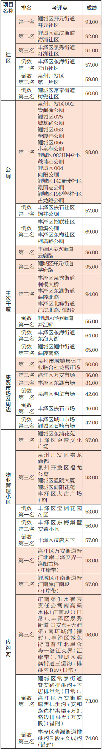 2020年8月份泉州市城市管理综合考评成绩公示
