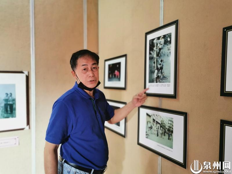 泉州收藏家蔡其呈在自己拍摄的照片前讲解,这张照片拍自当年的泉州市义务劳动日,地点就在威远楼附近。