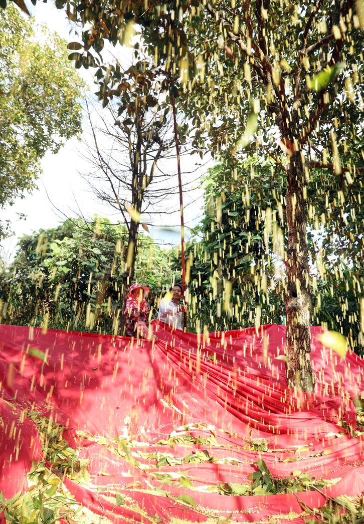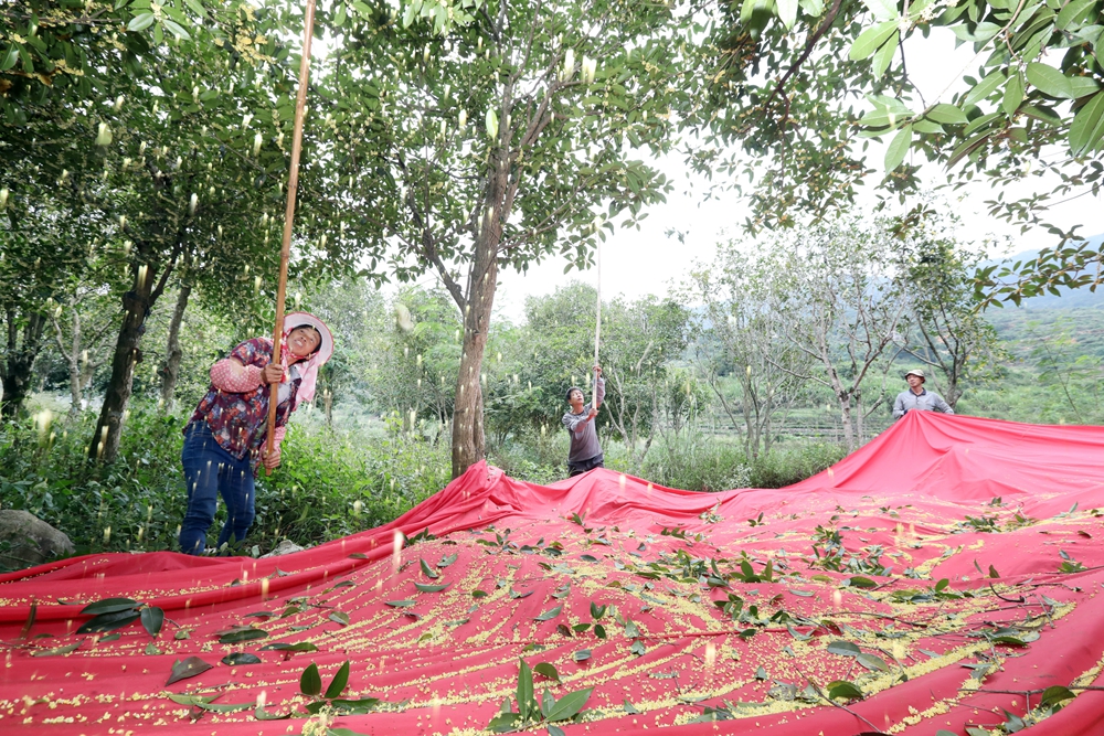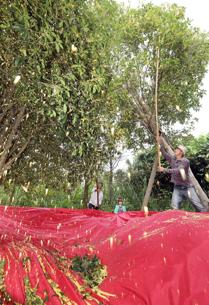 泉州网10月7日讯 (记者 张九强)10月7日早晨,在安溪县虎邱镇芳亭村,农户们正忙着打收桂花。
