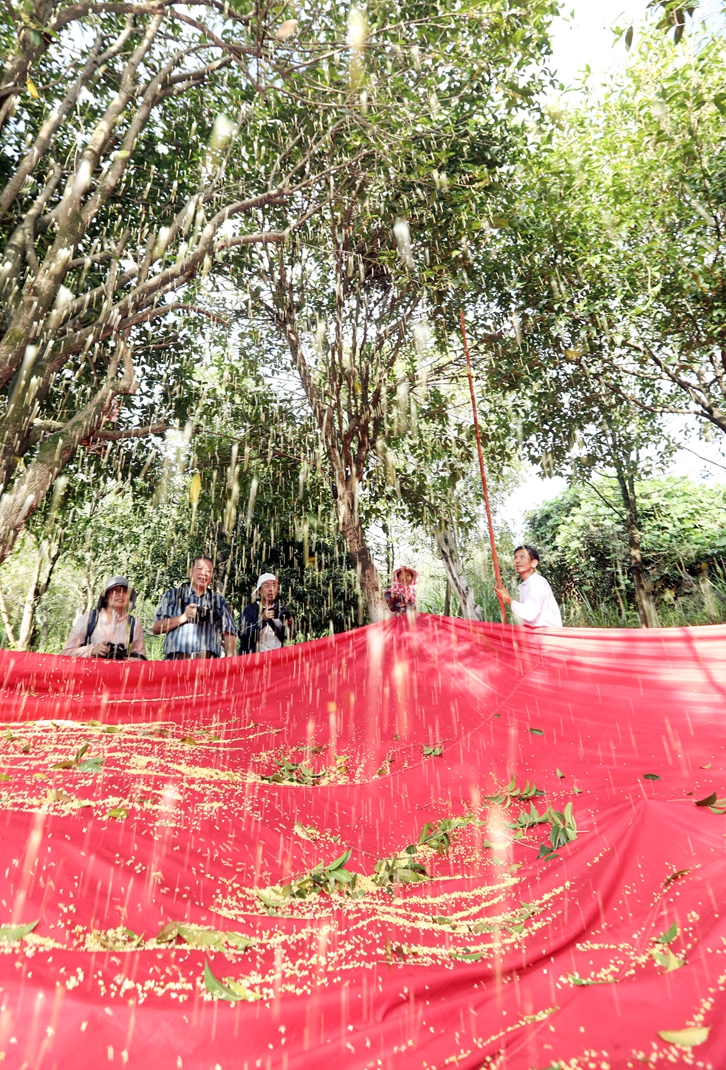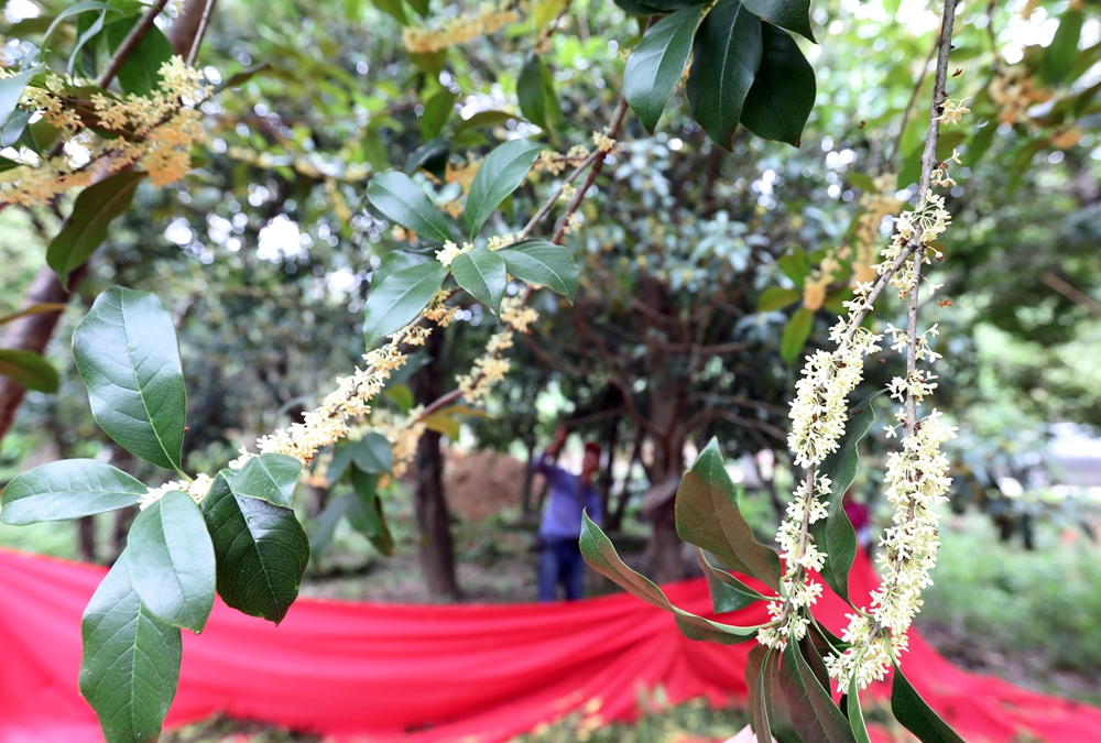寒露将至,安溪县虎邱镇芳亭村花香四溢,村里数万棵桂花树迎来盛花期,当地的农户们趁着天气晴好忙着打收桂花,制作桂花茶、桂花糕、桂花酒等产品。
