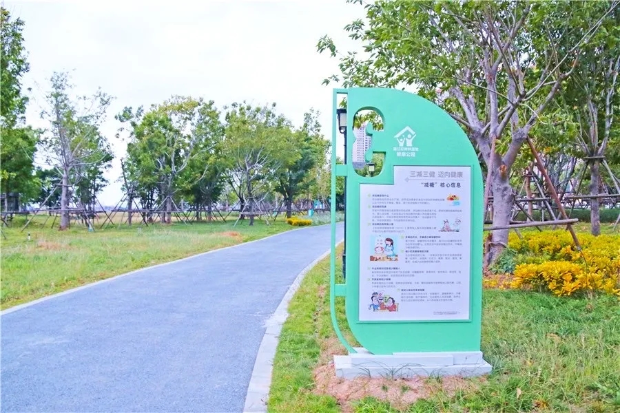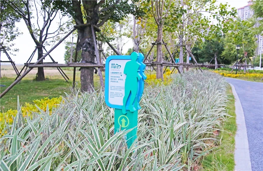 傍晚时分温度宜人,不少市民选择到公园内慢跑健身,全长600米的塑胶健身步道被绿植包围,沿途还设立“健康小贴士”“三减三健”等健康宣传标语牌,积极向大众倡导健康生活观念。