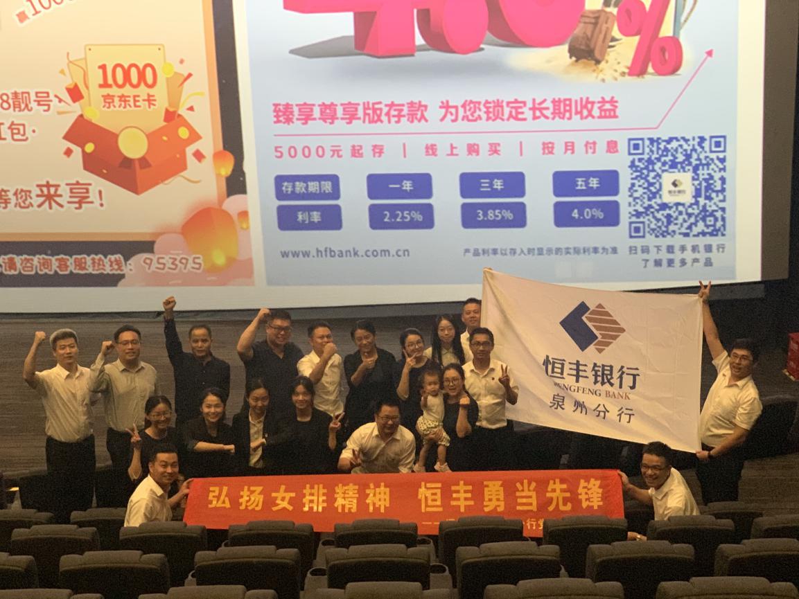 为进一步弘扬并学习中国女子排球队不屈不挠、不断拼搏的精神,加强与客户的联系、提升客户服务体验,在中秋国庆来临之际,恒丰银行泉州分行组织全行员工并邀请150余名新老客户前往泉州东海泰禾影院共同观看国庆档电影《夺冠》。