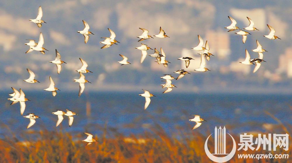 泉州网10月23日讯 寒露后,秋意浓。在泉州湾南岸石狮水头外线湿地,从西伯利亚来这里过冬的环颈鸻、黑腹滨鹬又一次展开了翅膀,被相机镜头所定格。从2016年冬首次被报道算起,西伯利亚候鸟石狮过冬已进入“第五季”,其足迹也从最初的石湖红礁,延伸至如今的水头外线、湿地公园等区域。