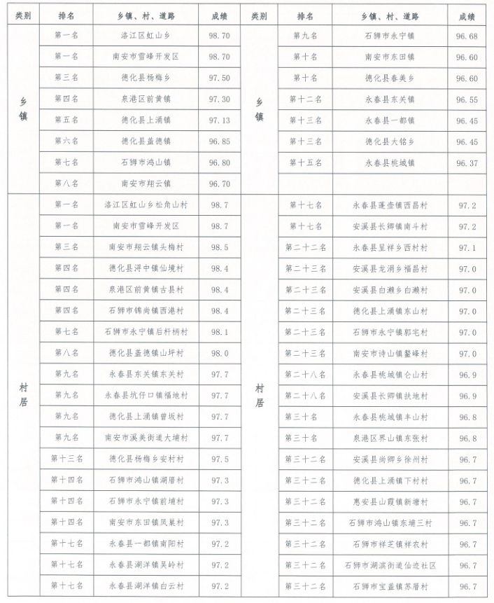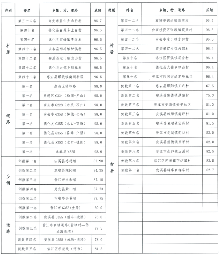 泉州网10月29日讯(记者 黄艺芬 通讯员郑培嵘)9月,泉州抽评10个县(市、区)146个乡镇的381个村、117段道路及3个工业区,共发现问题3541处(村居3084处,道路457处)。90分及以上的村共有312个,占81.9%;80分(含80分)至90分的村共有67个,占17.6%;70分(含70分)至80分的村共有1个,占0.3%。