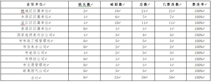 泉州网10月29日讯(记者 黄艺芬 通讯员 郑培嵘)最近一期路面井盖设施缺失及破损专项考评结果显示,本期新发现井盖设施缺失或破损59个,已整59个,整改率100% 。