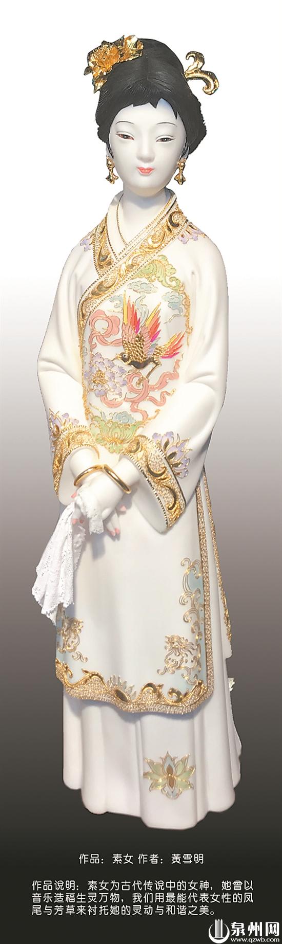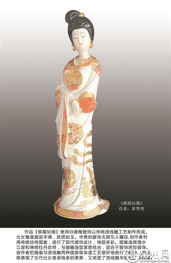 时至今日,她已创作出多件精致典雅的漆线雕作品:有的厚重朴实,有的唯美绚烂,有的清新脱俗。她的漆线雕作品,不仅遵从传统神佛装饰的脉络习惯,而且十分契合当下美学潮流的观念,尤其注重造像作品服装细节的把控,风格自成一派,先后获得各类比赛十余项大奖,载誉满满。她在作品《华冠丽服》中运用传统线雕工艺制作新娘服饰:面容姣好的新娘,双眸灵动,肤如脂玉,头顶数十朵金花,花蕊为熠熠生辉的红宝石。红色新娘妆为传统对襟式,团纹图案。金线勾勒出两只飞舞的凤凰,凤凰来仪,寓意吉祥美好。双肩及双袖皆为团花金牡丹,雍容华贵。在华冠丽服的映衬之下,新娘显得十分娇媚动人。而她的另一作品《倾国倾城》,则因为同时融合了陶瓷和漆线雕两种非遗工艺,而显得颇为特别:仕女雕像面容丰满、肤白如瓷,华贵的服饰尤为引人注目。黄雪明在创作时巧妙地运用了传统纹样图案,并进行现代装饰设计,将海水江崖及锦绣牡丹的纹样,与瓷雕造型紧密结合,既表现了古代仕女身体线条的柔美,又凸显出了漆线雕华丽的工艺风格……