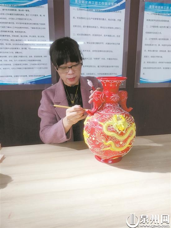 推开黄雪明工作室大门,她正聚精会神、一丝不苟地进行漆线雕的作品创作。一支改造过的漆线雕专用的小楷笔在她的手中泛着智慧的光芒,随着她灵活的手指不断变换着笔法,另一只手也没停下来,细薄如丝的漆线源源不断从缠绕的筷子中延伸出来,巧妙地贴合在陶瓷光滑的瓷面上,绽开了一道道极具灵气的花纹……一阵子功夫之后,一条条气宇轩昂、张牙舞爪的飞龙,一只只羽翼丰盈、展翅翱翔的凤凰,横空出世,栩栩如生,令漆线雕工艺品拥有了独特的韵味与灵性。